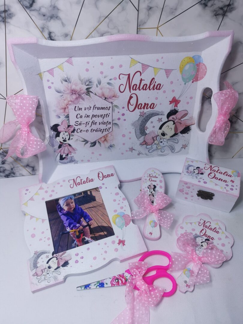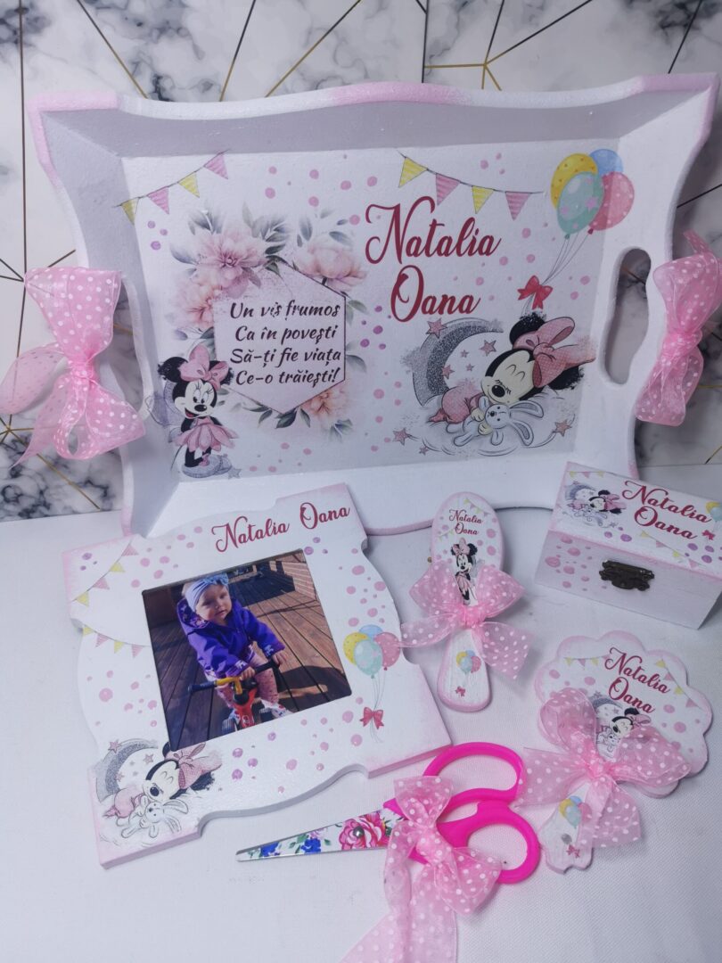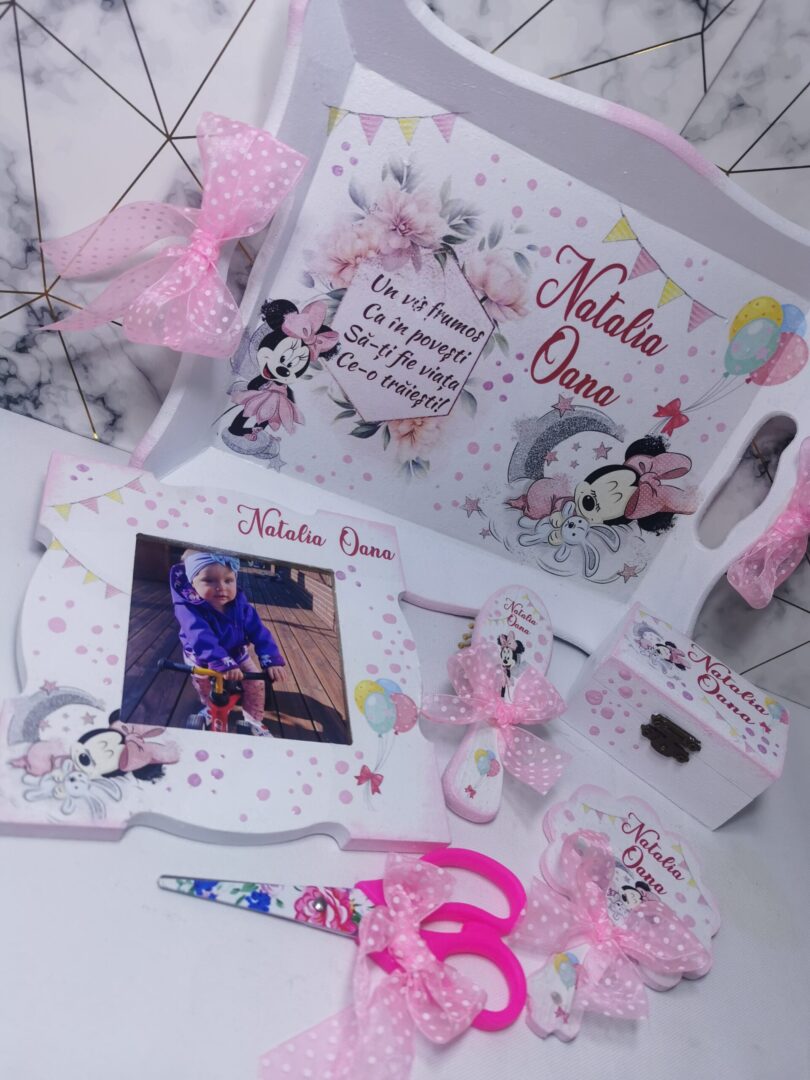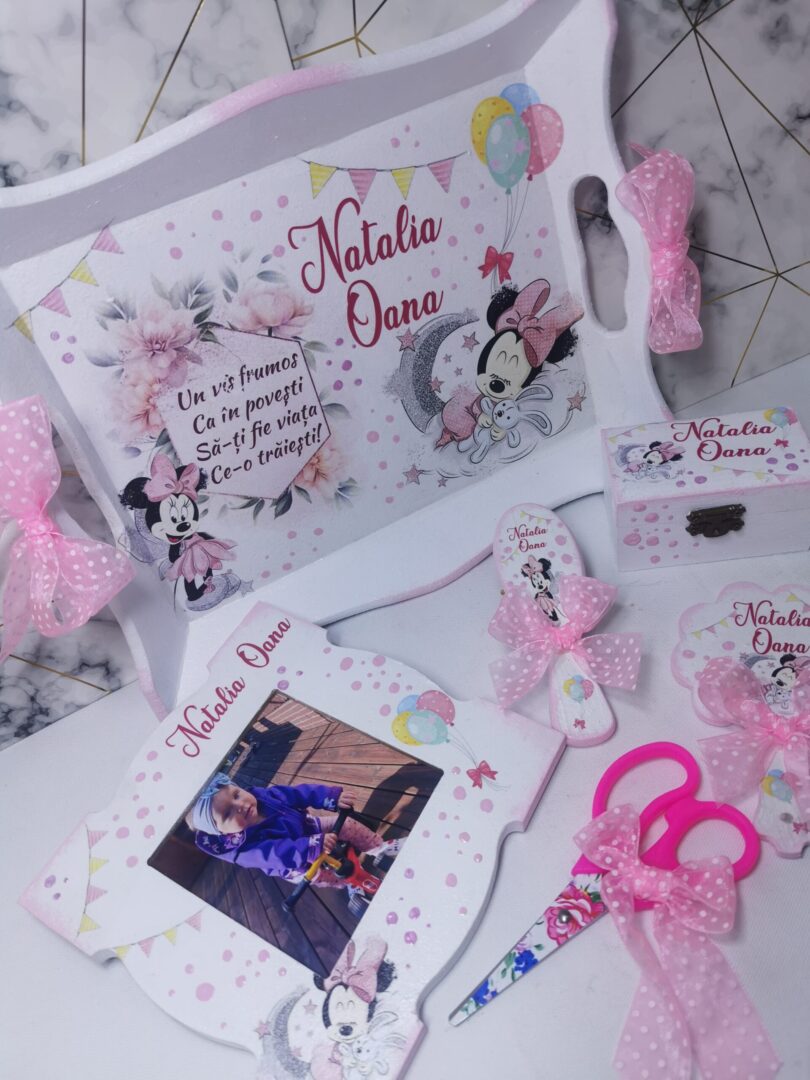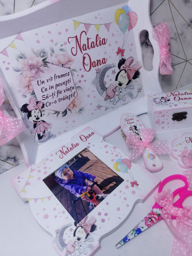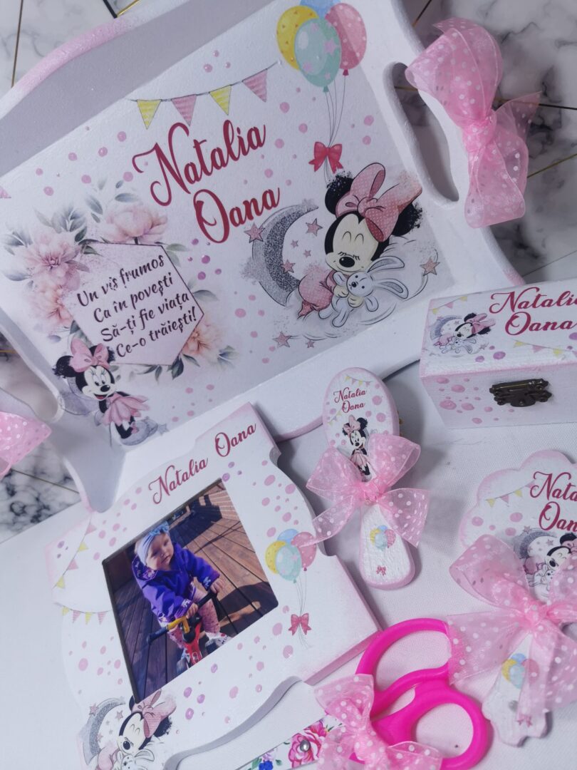 Set Tavita Taiere Mot Minnie Mouse pentru tăierea moțului personalizat, conține: tăviță, cutiuță, perie, oglindă și ramă foto. Puteți configura setul și doar cu o parte dintre obiecte (ex: tava + cutie + perie).